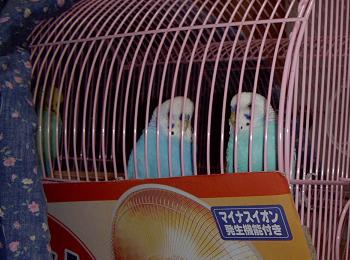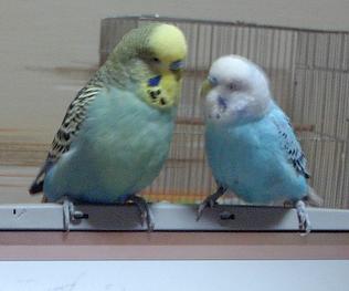 | 先月全身換羽してて何となくシュンとしてたハッピーたんは、羽が生えそろった今では元気いっぱい☆ 外に出したら子分を引き連れて(みんなが勝手についていくんだが)あちこち飛び回り、ご機嫌印の首振り (↓このアニメとはちょっと違うんだけど、チュルチュルチュル♪と鳴きながら全身でうんうんうんとうなづいてる状態)を何度も何度もやっている。  人がカーペットの上に寝そべっているとパソコンの上に止まってきて(必ず1羽子分つき)じ〜っとこちらを見下ろしている。 写真はピーたんとたわむれてます。 何度も何度もチュウしまくってお熱いですなぁ。  ぴよっこ達をかごに入れるときはいつもハッピーたんをおとりにして一番に入れていたんですが、近頃知恵がついてしまったハッピーたん。 入れようとしたら逃げられるようになってしまいました。 なので最近は食いしん坊のピーたん(お腹すかせているのですぐにかごに入ってくれて楽です^^♪)に一番にかごに入ってもらってます。 | |